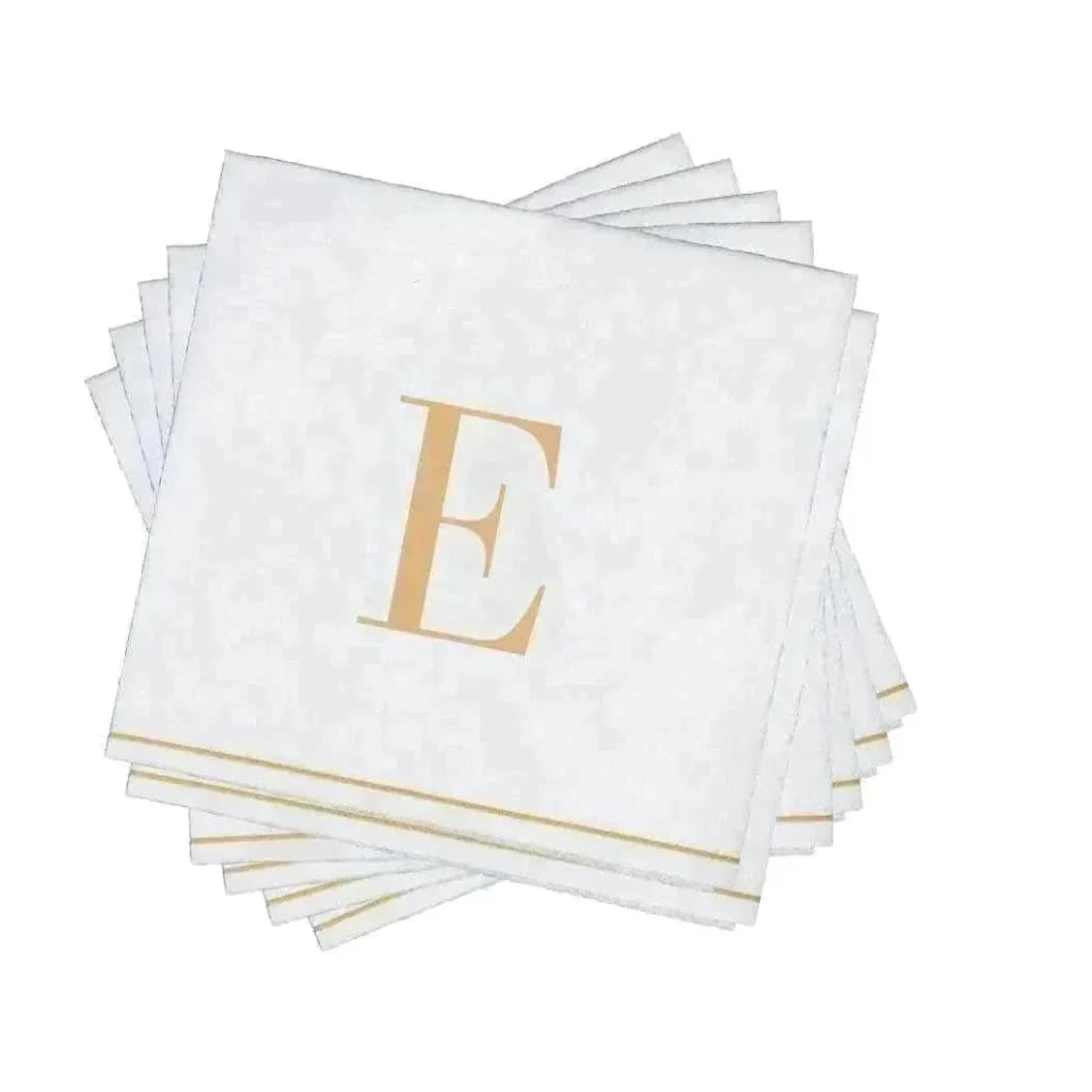 Letter E White and Gold Monogram Cocktail Paper Disposable Napkins | 16 Napkins