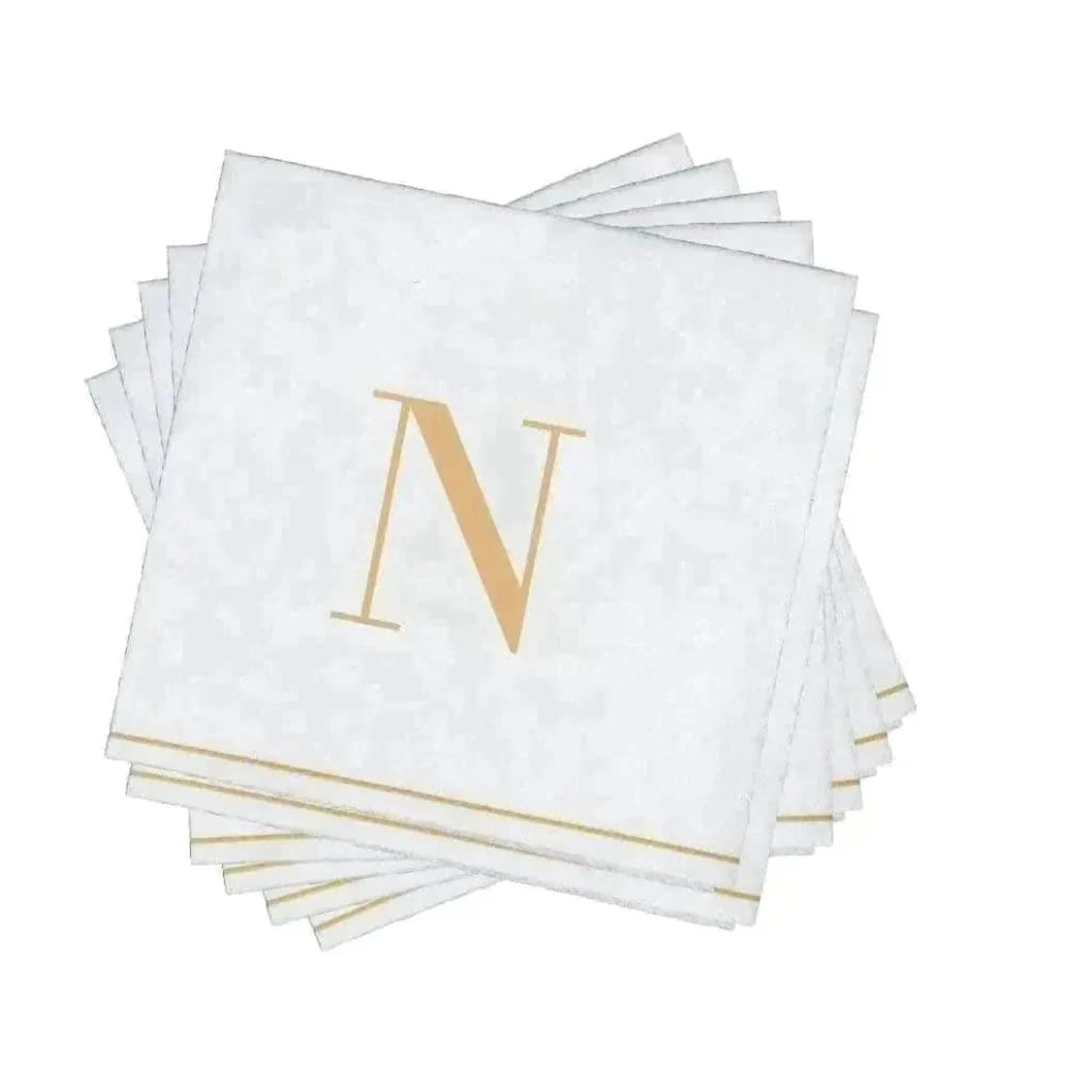 Letter N White and Gold Monogram Cocktail Paper Disposable Napkins | 16 Napkins