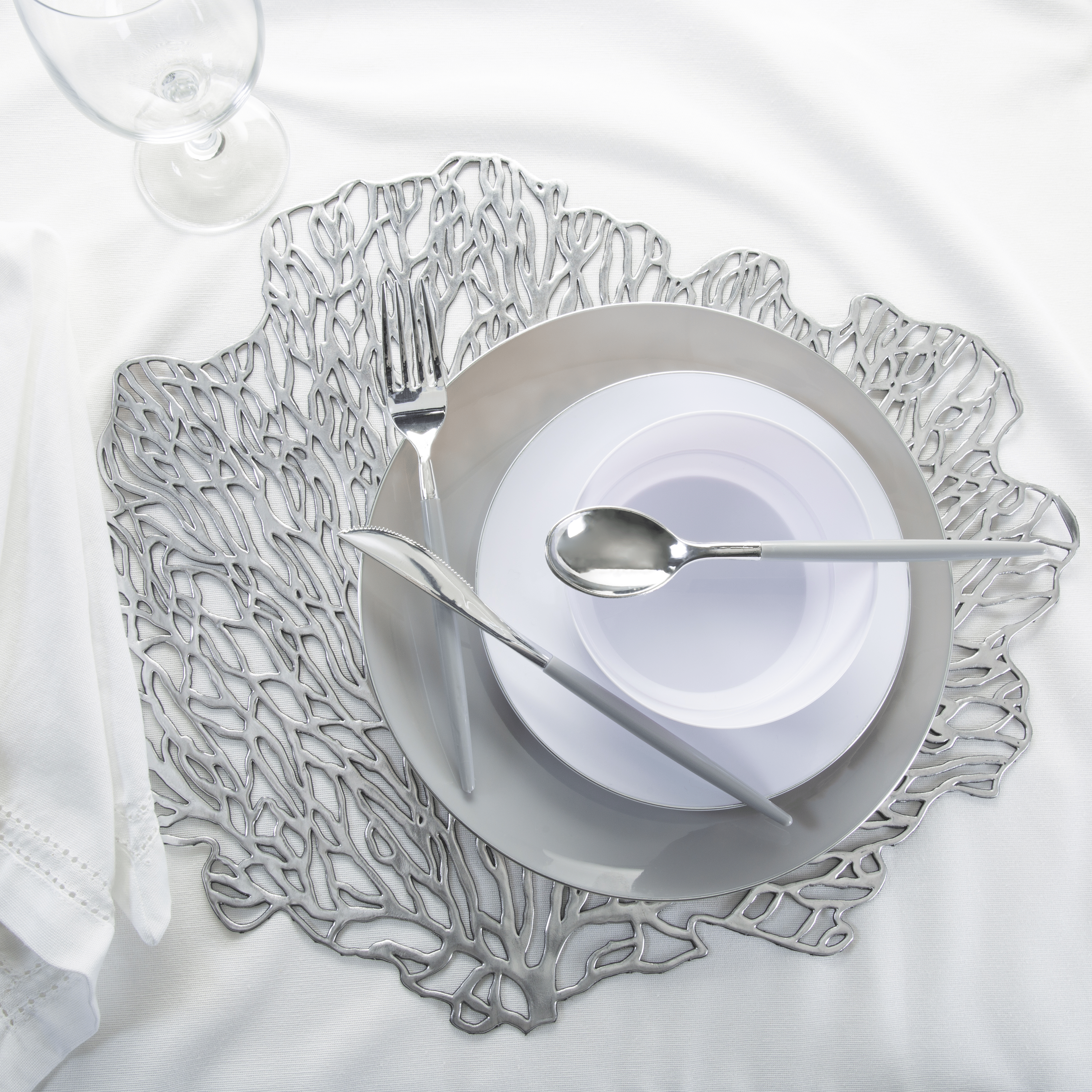 ["01-Gray and Silver Round","27023-SILVER","Charger Plates","Chargers","Gray and White Lifestyle - 1","placemats","Silver Charger","Silver Trim"]