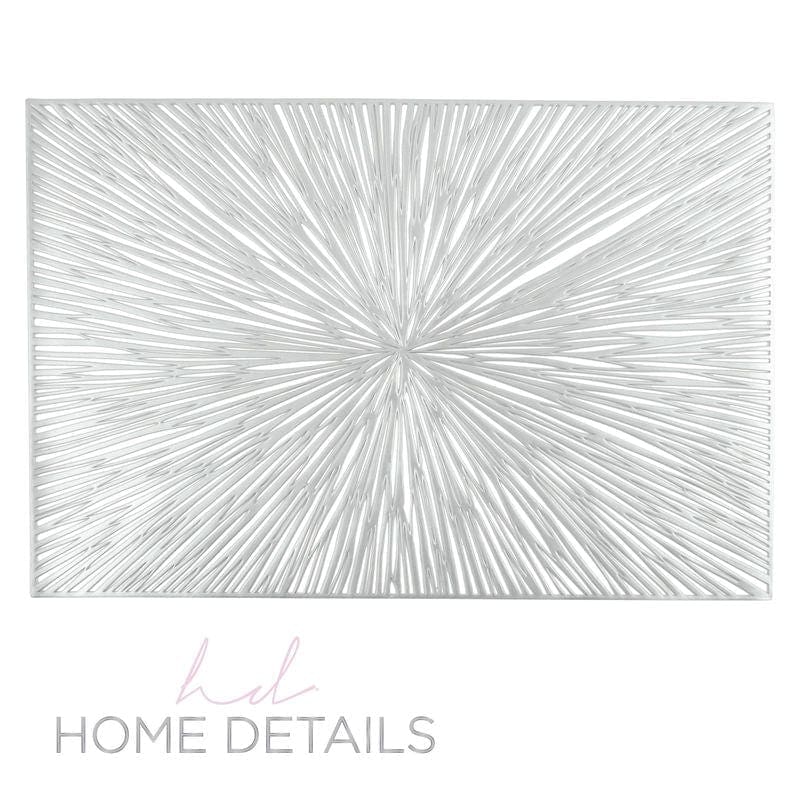 Add the finishing touch to your dining room table with the Home Details Star Burst Laser Cut Placemat. The unique and glamorous design will add the right touch to help elevate your place settings. These placemats are perfect for your holiday and dinner parties. Create a picture-perfect place setting to impress your guests. The durable PVC material is long lasting and will protect your table from scratches. When done using, they are easy to clean by wiping them down with a cloth. No kitchen table setting is complete without the Home Details Placemats.