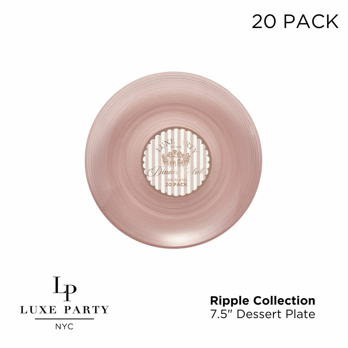 Welcome to Luxe Party's Round Ripple Rose Plastic 7.5" Appetizer Plates, the perfect choice for serving your meals with style and sophistication at your next event.
