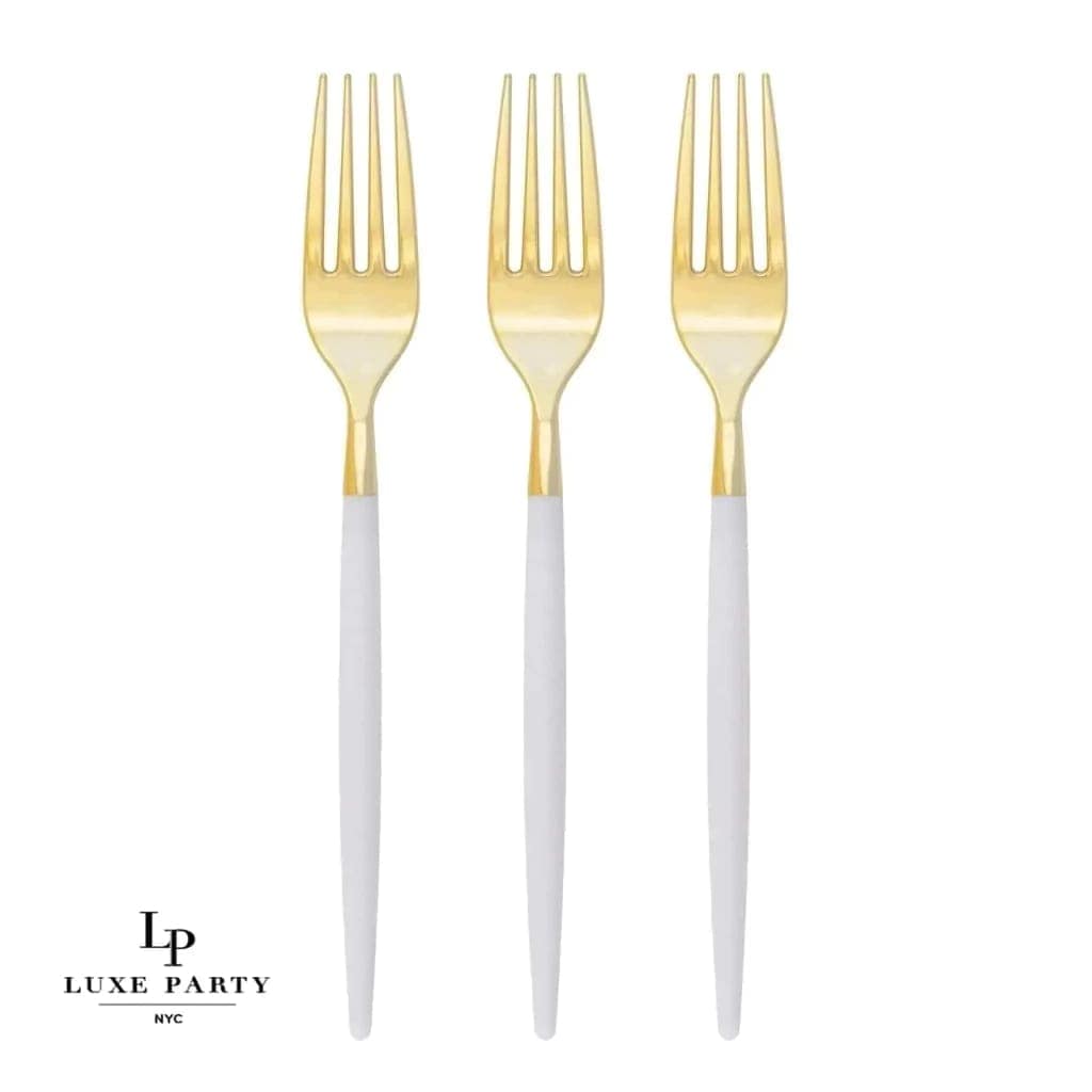 Introducing our elegant White and Gold Plastic Forks, the perfect choice for your upscale events. These forks combine style and functionality for a memorable dining experience.