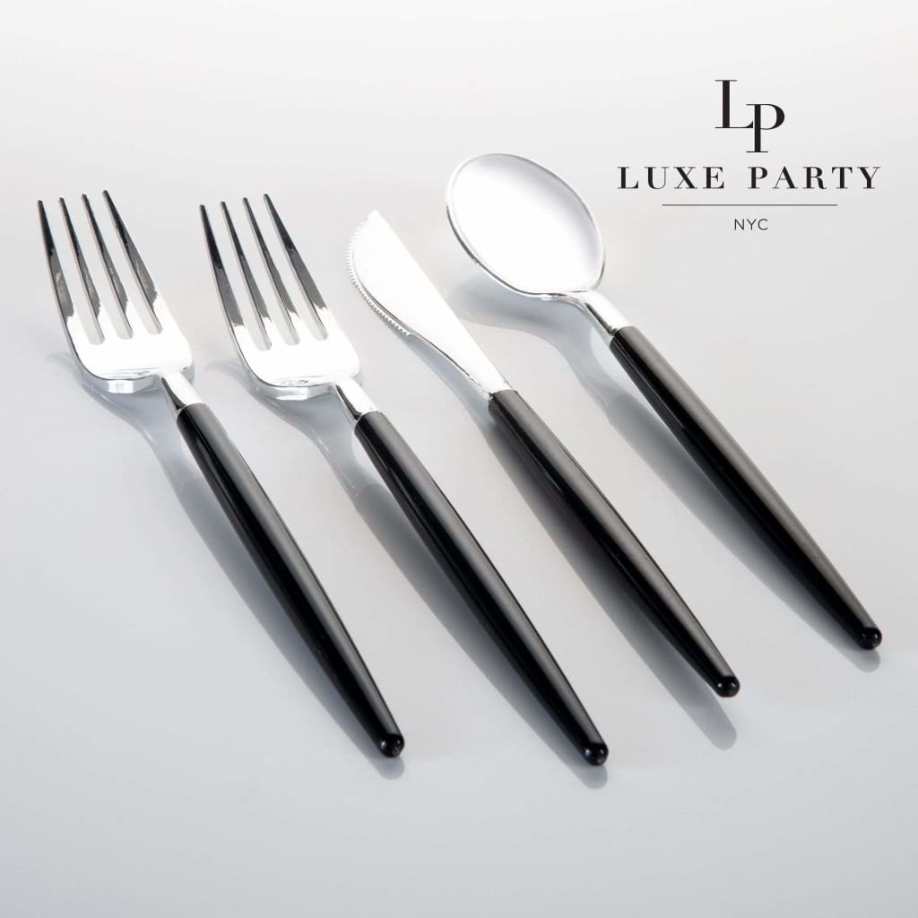 Welcome to Luxe Party, where elegance meets convenience with our Black and Silver Two-Tone Plastic Cutlery Set. Elevate your event with this stylish and practical choice.